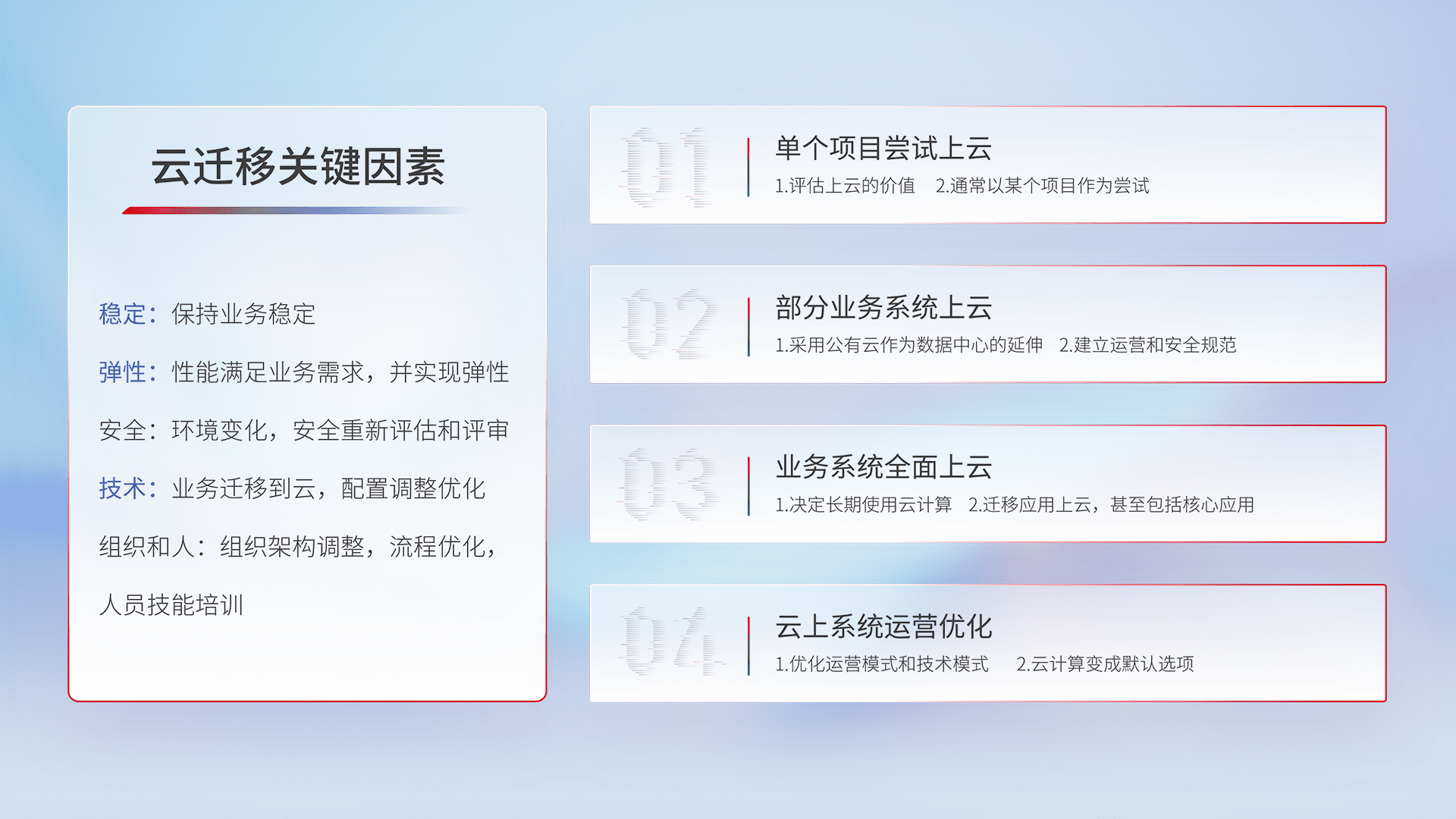 结合实际业务,,,,从规划设计、、云平台选型、、、、云原生改造、、、数据迁移、、、集成交付,,迁移全过程为客户识别最佳上云路径,,,做好风险识别管理,,,设计网络架构、、身份权限、、安全审计合规、、操作审计、、日志审计、、、监控告警策略、、、多站点容灾设计等,,,对云上基础设施进行整体规划,,,提升IT治理水平,,以满足弹性、、、高可用、、、高性能的需求。。。