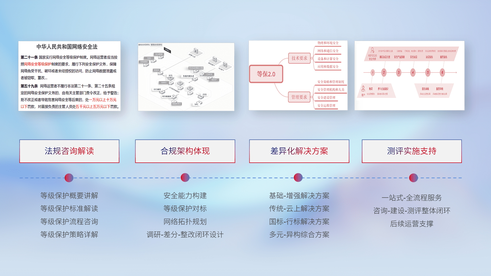 通过专业的法律咨询解读、、、合规架构体现、、差异化解决方案、、、测试实施支持等服务,,为客户量身打造等保合规体系。。
